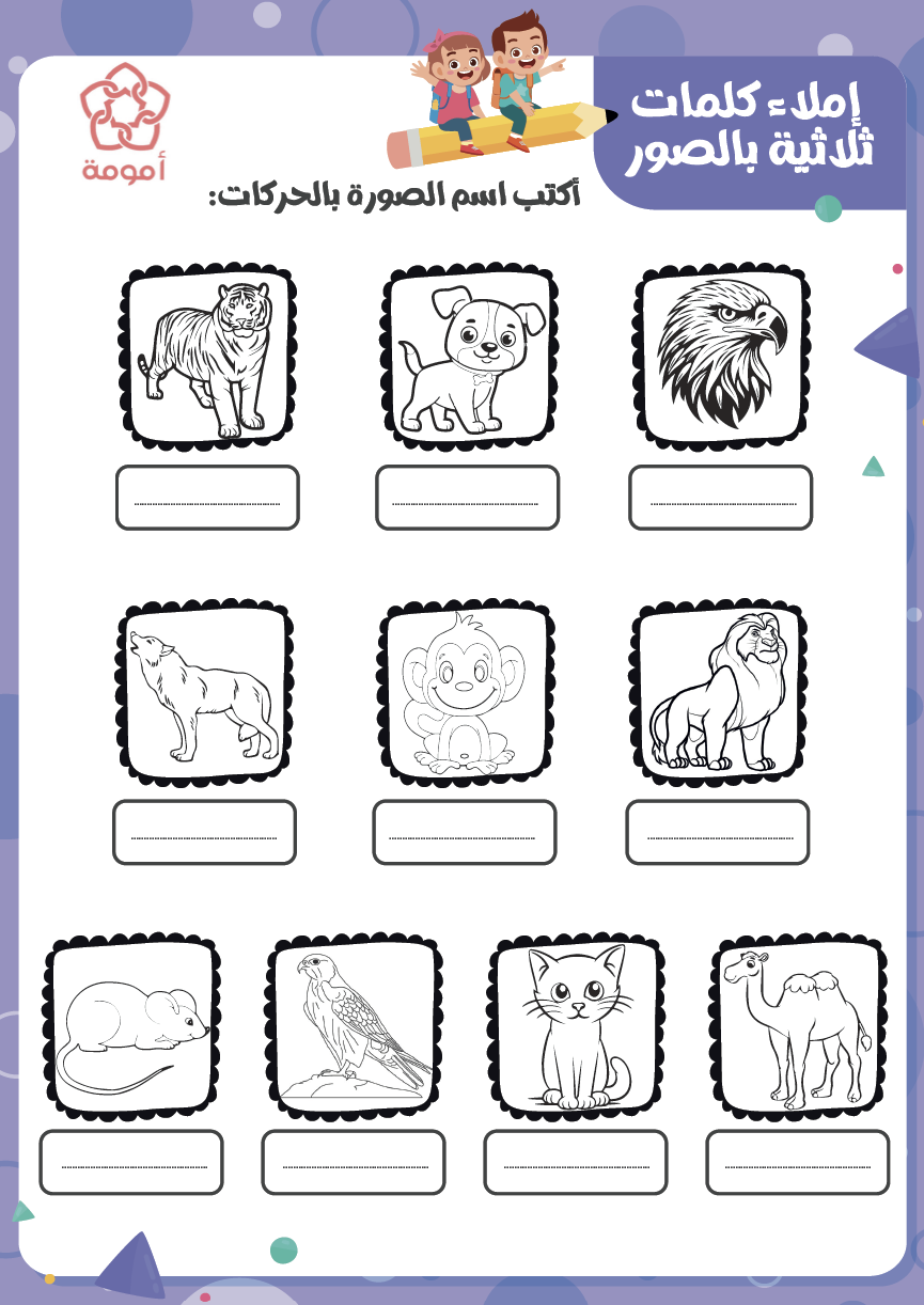 - الإملاء: يتدرب الطفل على الإملاء من خلال الصور وبالتدرج في الصعوبة من كلمات ثلاثية ل رباعية وعدد الكلمات 100 كلمة.