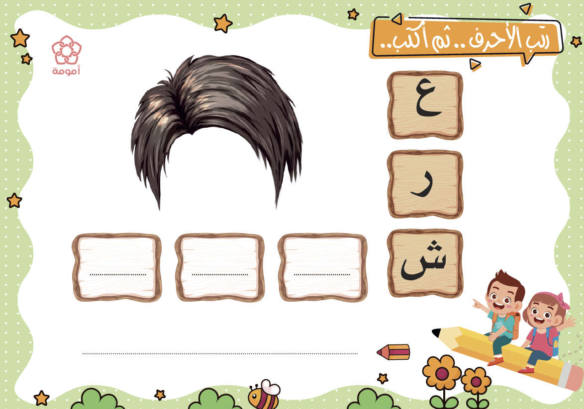 - رتب الاحرف ثم اكتب: يحتوي النشاط على 18 بطاقة من خلالها يستطيع الطفل كتابة الكلمة بالنظر إلى الصورة والأحرف