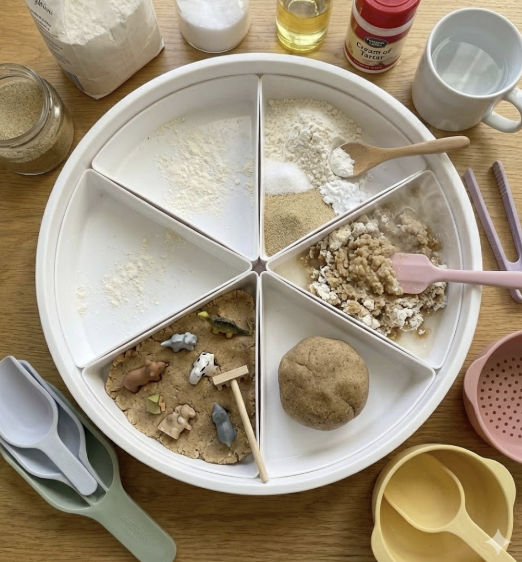 صينية اللعب المقسمة (الأساس): القاعدة الرئيسية لكل الأنشطة! بتصميم دائري ذكي وأقسام مثلثة قابلة للإزالة، تمنح طفلك مساحة منظمة للعب بالرمل، الماء، أو الحبوب دون فوضى.