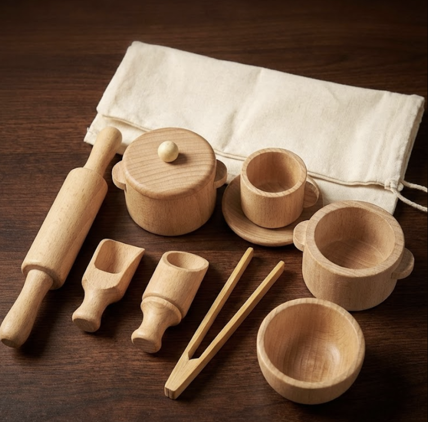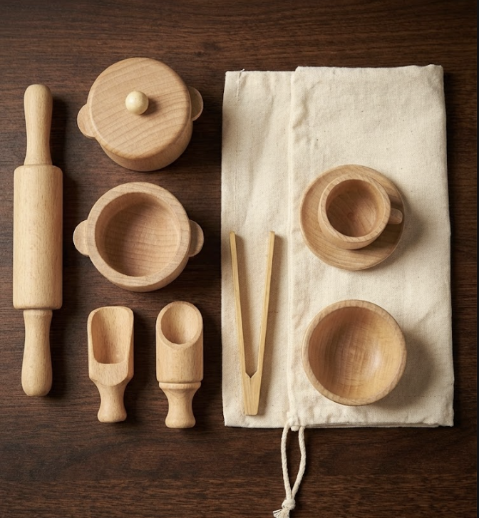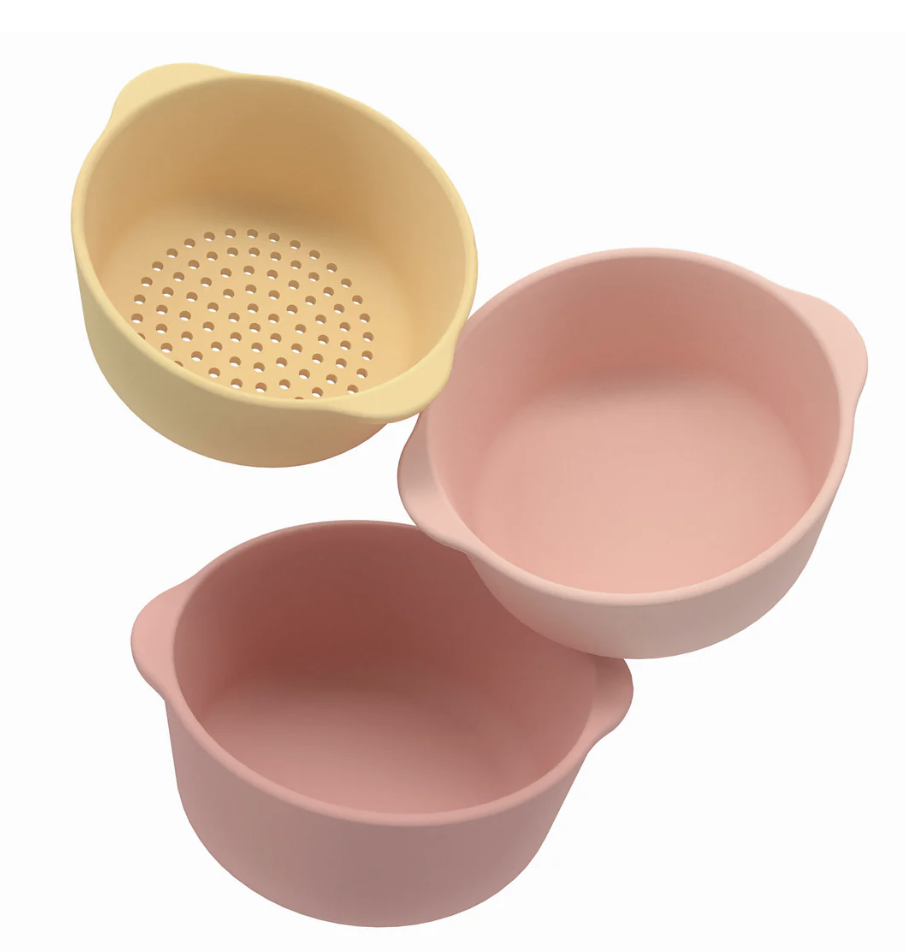 طقم الأواني والمصفاة (للتصفية والدمج): 3 قطع (وعاءان ومصفاة) لغربلة الرمل أو فصل الألعاب عن الماء، مما يضيف بعداً جديداً من “السبب والنتيجة” لتجربة اللعب.