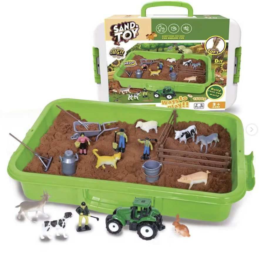 هل يحب طفلك الحيوانات والطبيعة؟ هذا الصندوق ينقل أجواء الريف إلى غرفته!  يحتوي على 1.5 كجم من الرمل البني الذي يحاكي لون التربة الزراعية الطينية، مع مجموعة متكاملة من حيوانات المزرعة (أبقار، خراف، خيول)، ومزارعين، وجرار زراعي (Tractor)، وأدوات حراثة، وأسوار.